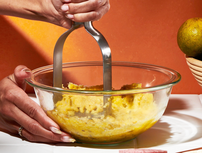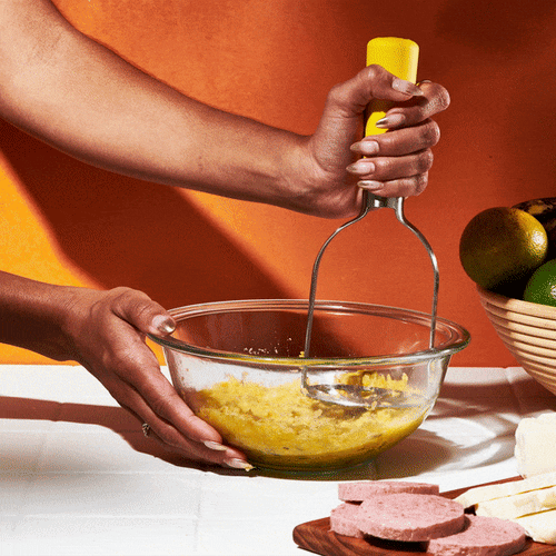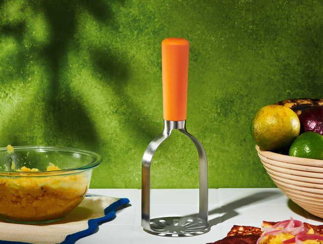 We shaped our masher with a slightly curved base to fit the corners of any bowl, and gave it the strength to mash up morning mangú, beans, todo. Plus, it has a wide no-slip grip, so it fits perfectly in our hands—and our cocina. ¡Hermosura!