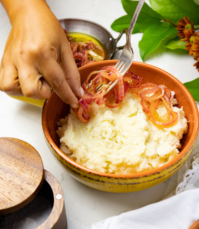 Ditch the potatoes! This rich, garlicky yuca mash topped with the vibrant taste of creole-style red onions is a must-have at your dinner table year-round!