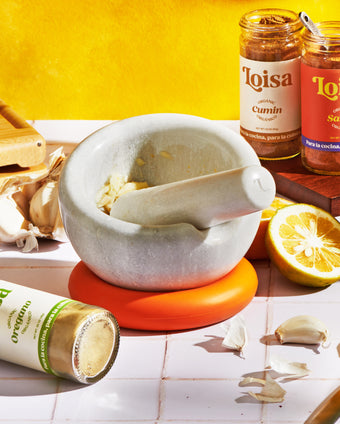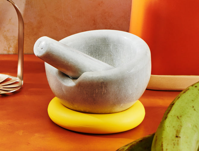 Our mortar y pestle set is designed with a bowl that's separate from its base for easy repositioning.