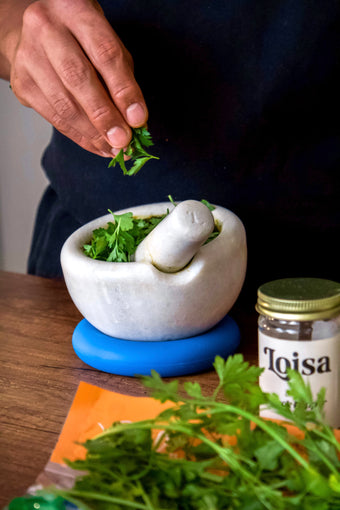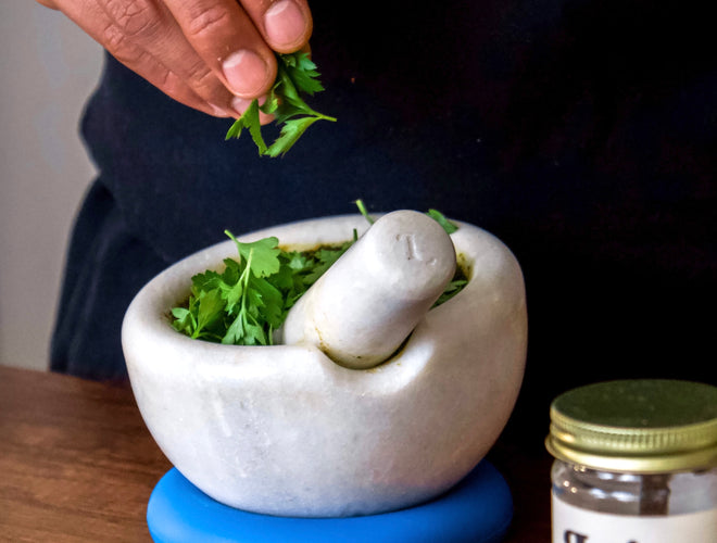 Our newest mortar & pestle is carved from pure granite stone for added strength and durability. With a separate silicone base for positioning the mortar at any angle we choose, plus a ridged interior for easier grinding, this is our favorite new tool for mixing up fresh flavor.