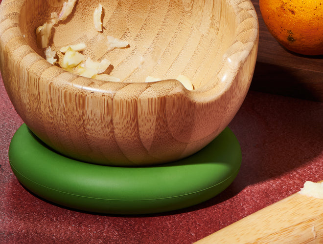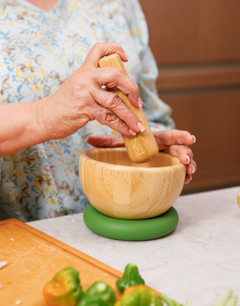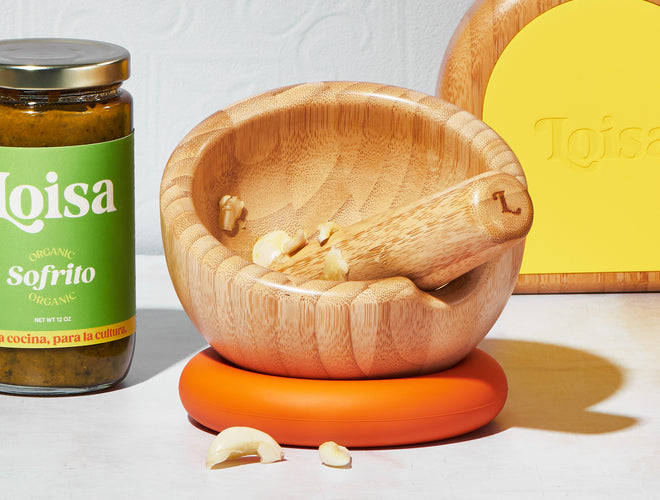 We designed our 100% bamboo mortar & pestle with a separate silicone donut base so we can comfortably mix mojos, spices, y más from any position with ease.